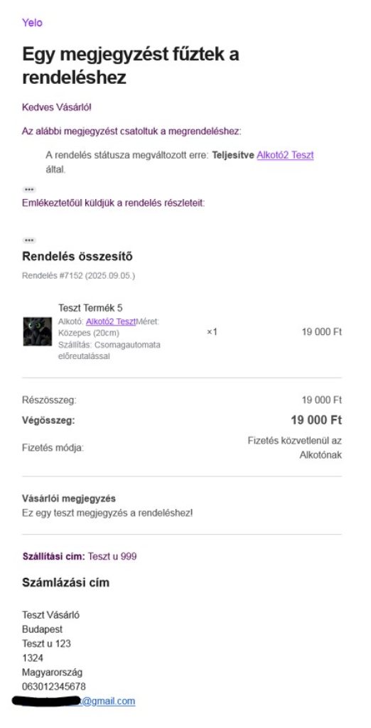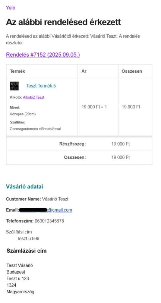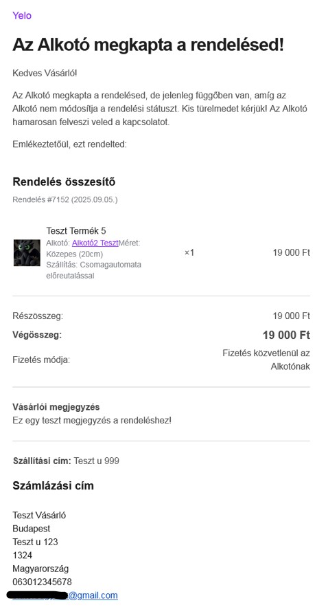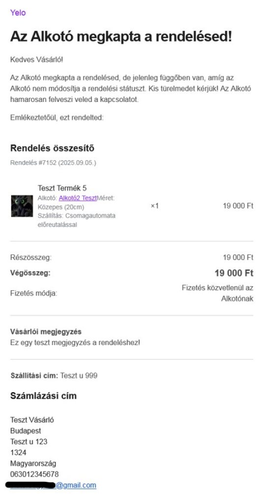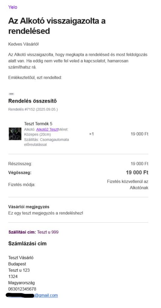 Minta e-mail az Alkotónak, miután a Vevő terméket rendelt.