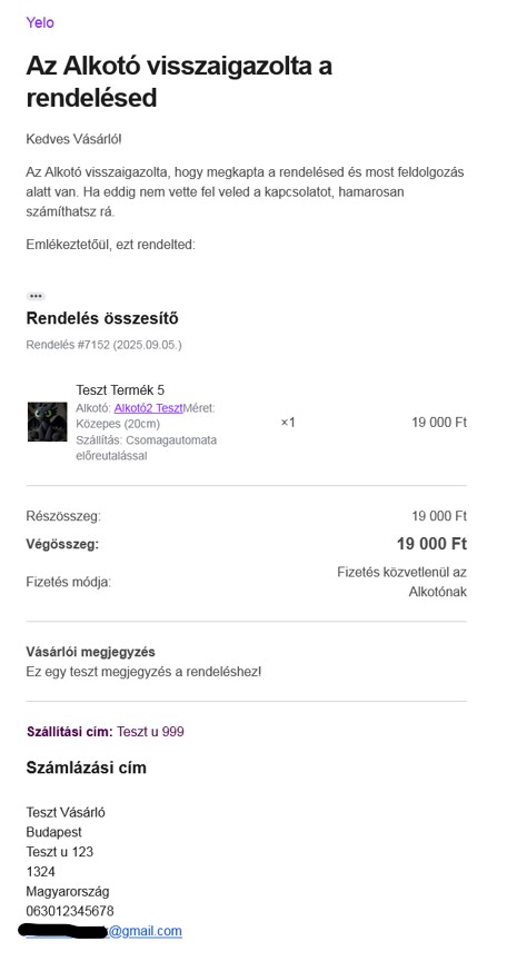 Minta e-mail a Vevőnek, miután az Alkotó visszaigazolta a megrendelést.